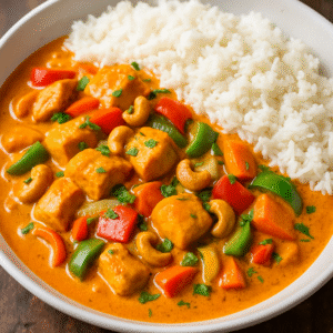 Frango ao Curry Tailandês com Arroz de Jasmim e Castanhas de Caju