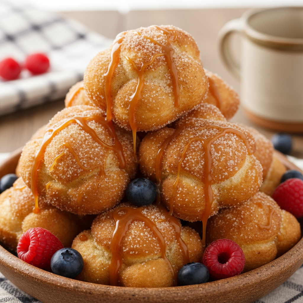 Prepare-se para uma experiência de sabor e textura que eleva o clássico bolinho de chuva a um patamar gourmet com os Bolinhos de Chuva Dourados com Calda de Caramelo Salgado e Frutas Vermelhas. Cada bolinho é frito à perfeição, resultando em uma casquinha dourada e crocante que esconde um interior incrivelmente macio e aerado, com um toque sutil de baunilha e raspas de limão. A magia acontece quando esses pequenos tesouros são generosamente polvilhados com uma mistura delicada de açúcar e canela, e então regados com uma calda de caramelo salgado caseira, que adiciona uma dimensão de sabor agridoce e sofisticada. Para completar a experiência, frutas vermelhas frescas, como framboesas e mirtilos, são espalhadas, trazendo um contraste vibrante de acidez e frescor que limpa o paladar. Este prato não é apenas uma sobremesa, mas uma obra de arte culinária que combina o conforto da tradição com a elegância da inovação, perfeita para um brunch especial, um chá da tarde requintado ou para surpreender seus convidados com um toque de doçura e criatividade.