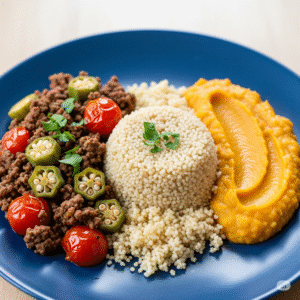 Picadinho de Quiabo com Cuscuz e Purê de Abóbora