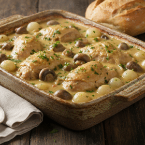 Frango Cremoso com Cogumelos e Cebolas Caramelizadas