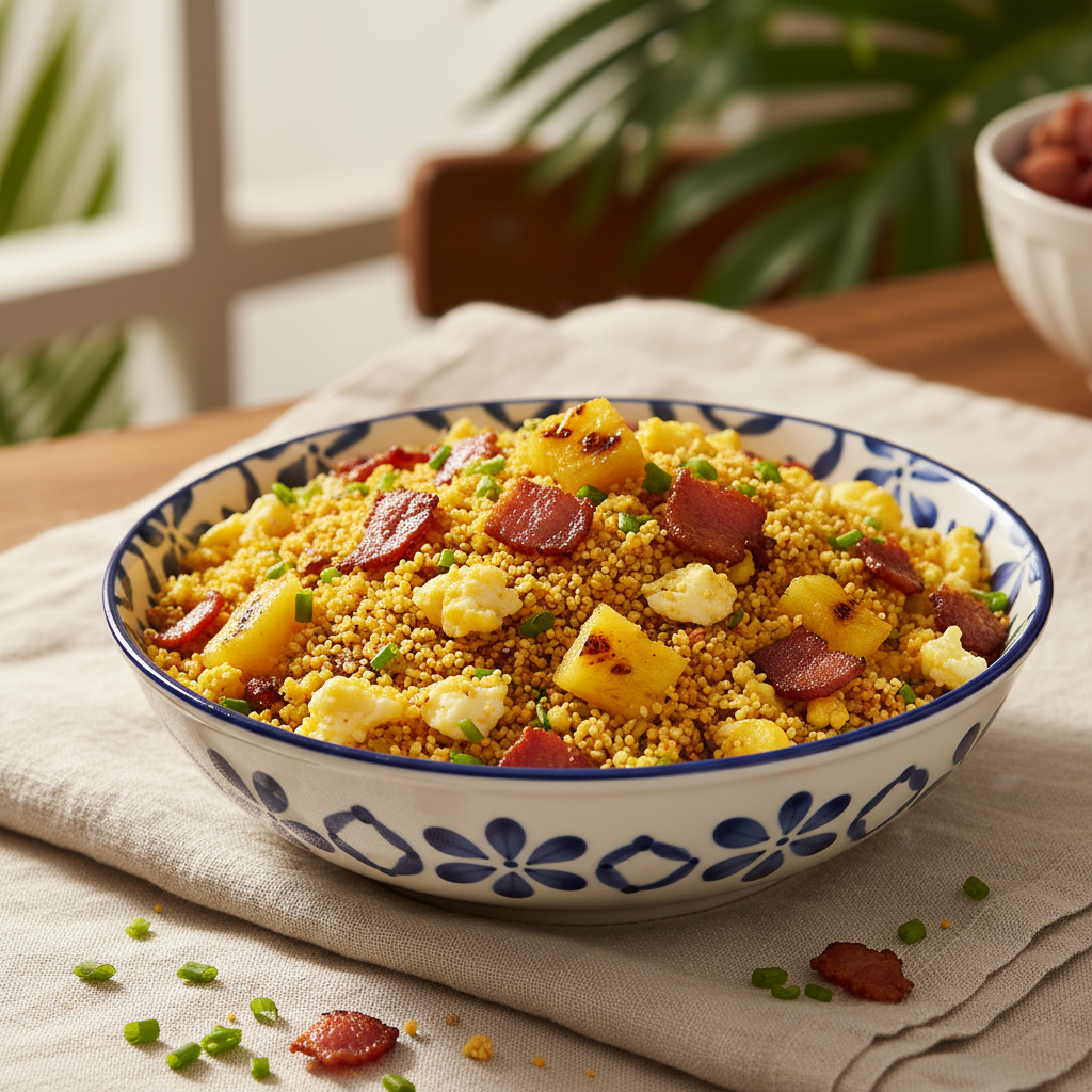Esta farofa é uma explosão de sabores e texturas, combinando o salgado do bacon crocante com a doçura e acidez do abacaxi grelhado. Perfeita para acompanhar churrascos, feijoadas ou como prato principal leve e saboroso. A adição de ovos mexidos e cebolinha fresca traz ainda mais riqueza e cor a este prato vibrante.