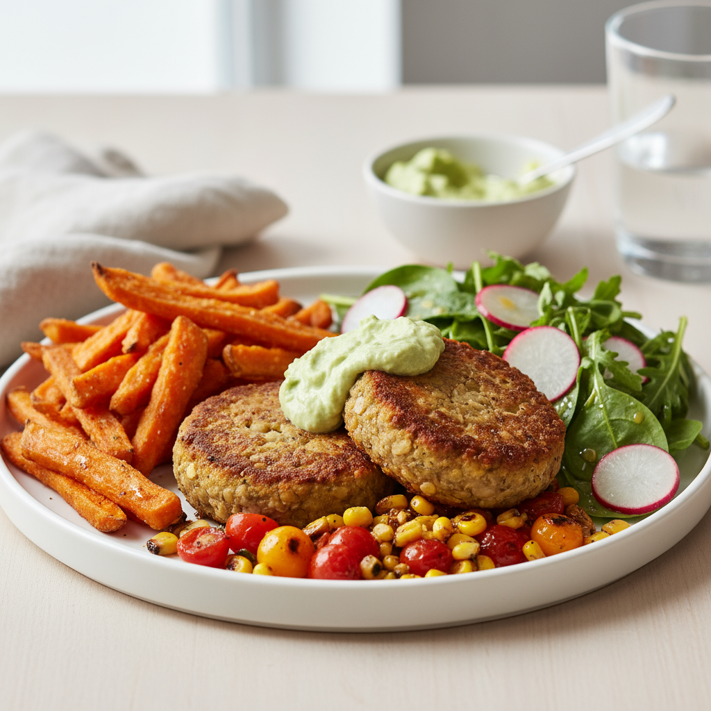 Este prato é uma explosão de sabor e nutrição, combinando a suculência de hambúrgueres vegetarianos de lentilha com a doçura e crocância da batata doce assada e a frescura de uma salada vibrante. É uma opção perfeita para quem busca uma refeição saudável, satisfatória e cheia de texturas e cores. A cremosidade do molho de abacate complementa perfeitamente a riqueza dos hambúrgueres, enquanto os vegetais frescos e assados adicionam um toque de leveza e vitalidade. Ideal para um almoço ou jantar nutritivo e delicioso.