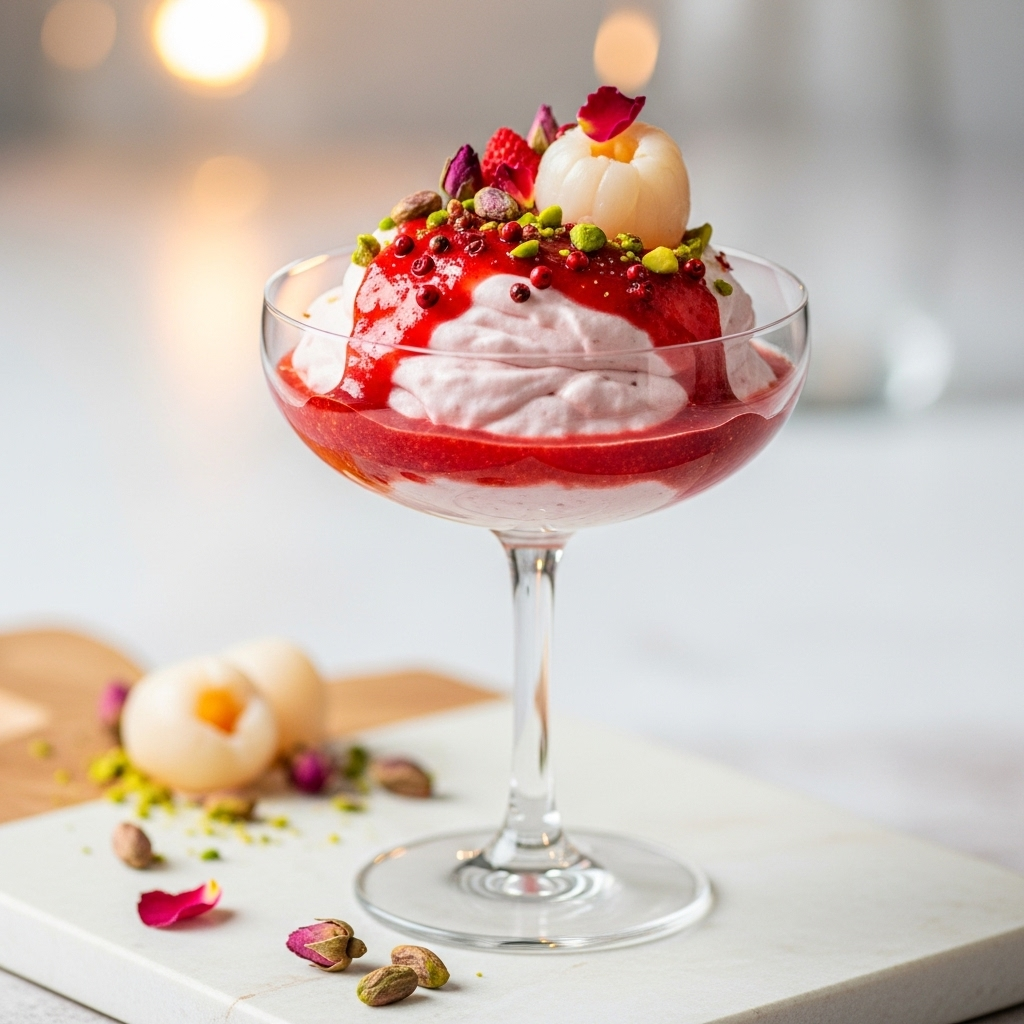 Inspirado na delicadeza do mousse de morango original, esta receita eleva a experiência a um novo patamar de sofisticação e exotismo. O “Néctar de Lichia e Rosas com Pistache Crocante” combina a doçura sutil da lichia com o aroma floral da água de rosas, complementado pela textura crocante do pistache e um toque picante da pimenta rosa. É uma sobremesa que agrada tanto ao paladar quanto aos olhos, perfeita para ocasiões especiais.