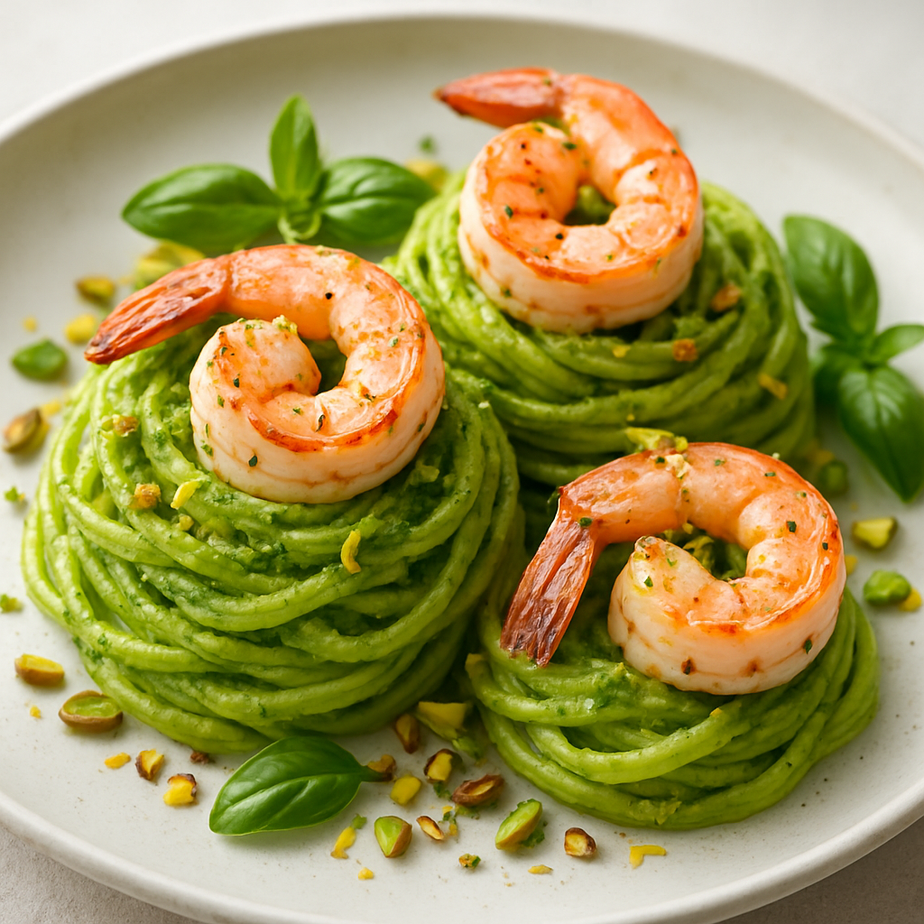 Uma releitura elegante e sofisticada da clássica massa, os Ninhos de Tagliatelle ao Pesto de Pistache e Camarão Grelhado são um convite a uma experiência gastronômica memorável. A delicadeza do tagliatelle se une a um pesto vibrante e aromático de pistache, manjericão e limão, complementado pela suculência de camarões grelhados. Um prato que equilibra frescor, sabor e textura de forma sublime.