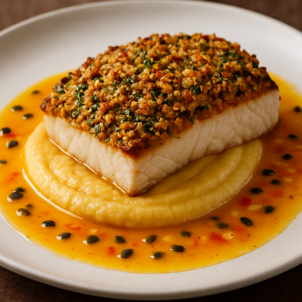 6.Montagem e Finalização: Sirva o pirarucu em crosta sobre uma porção generosa do purê de banana-da-terra. Regue com o molho agridoce de frutas tropicais. Decore com algumas folhas de coentro fresco ou flores comestíveis, se desejar. Sirva imediatamente.