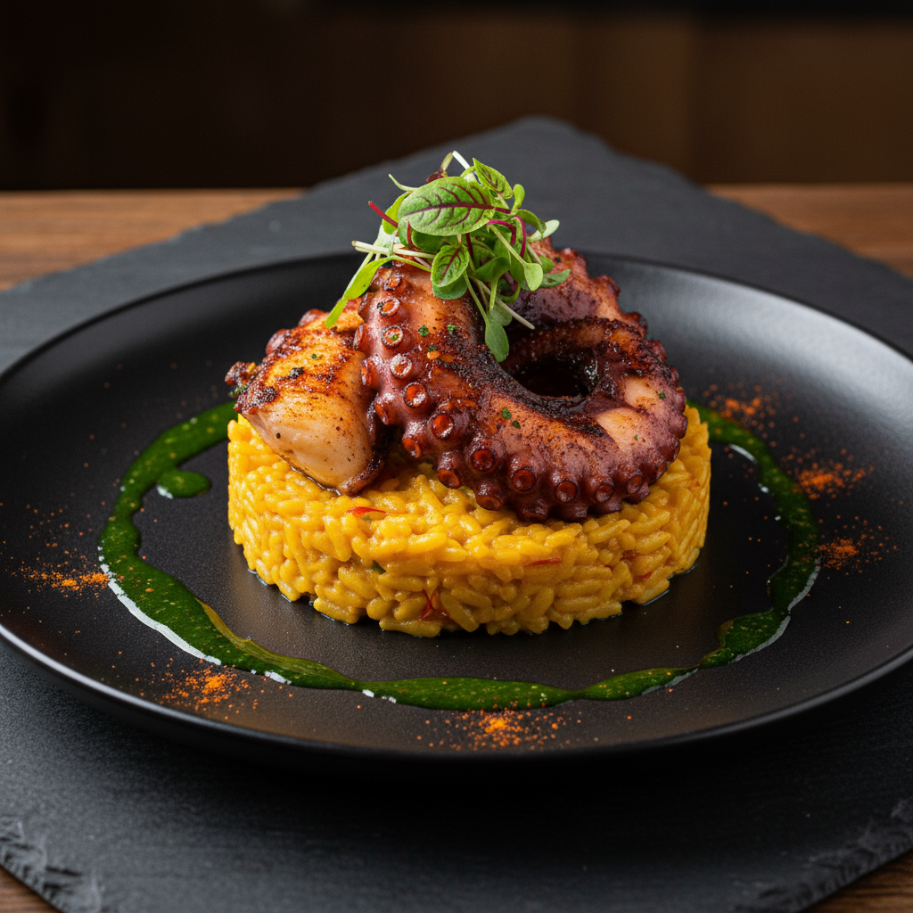 1.Sirva: Em pratos individuais, coloque uma porção generosa do risoto de açafrão no centro. Disponha os tentáculos de polvo grelhados elegantemente sobre o risoto.