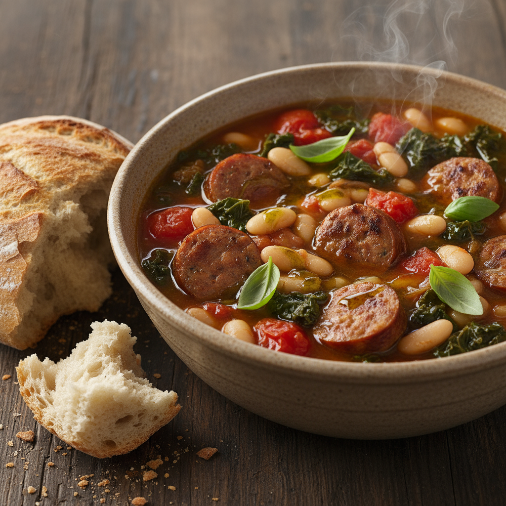 A Sopa Toscana de Feijão e Linguiça é um prato robusto e reconfortante, inspirado nos sabores ricos da culinária italiana. Esta sopa é uma fusão perfeita de linguiça italiana saborosa, feijão cannellini cremoso, couve toscana (cavolo nero) nutritiva e tomates doces, tudo cozido em um caldo aromático. É uma refeição completa e satisfatória, ideal para aquecer o corpo e a alma em qualquer estação. A combinação de ingredientes frescos e temperos vibrantes cria uma experiência culinária autêntica e memorável.